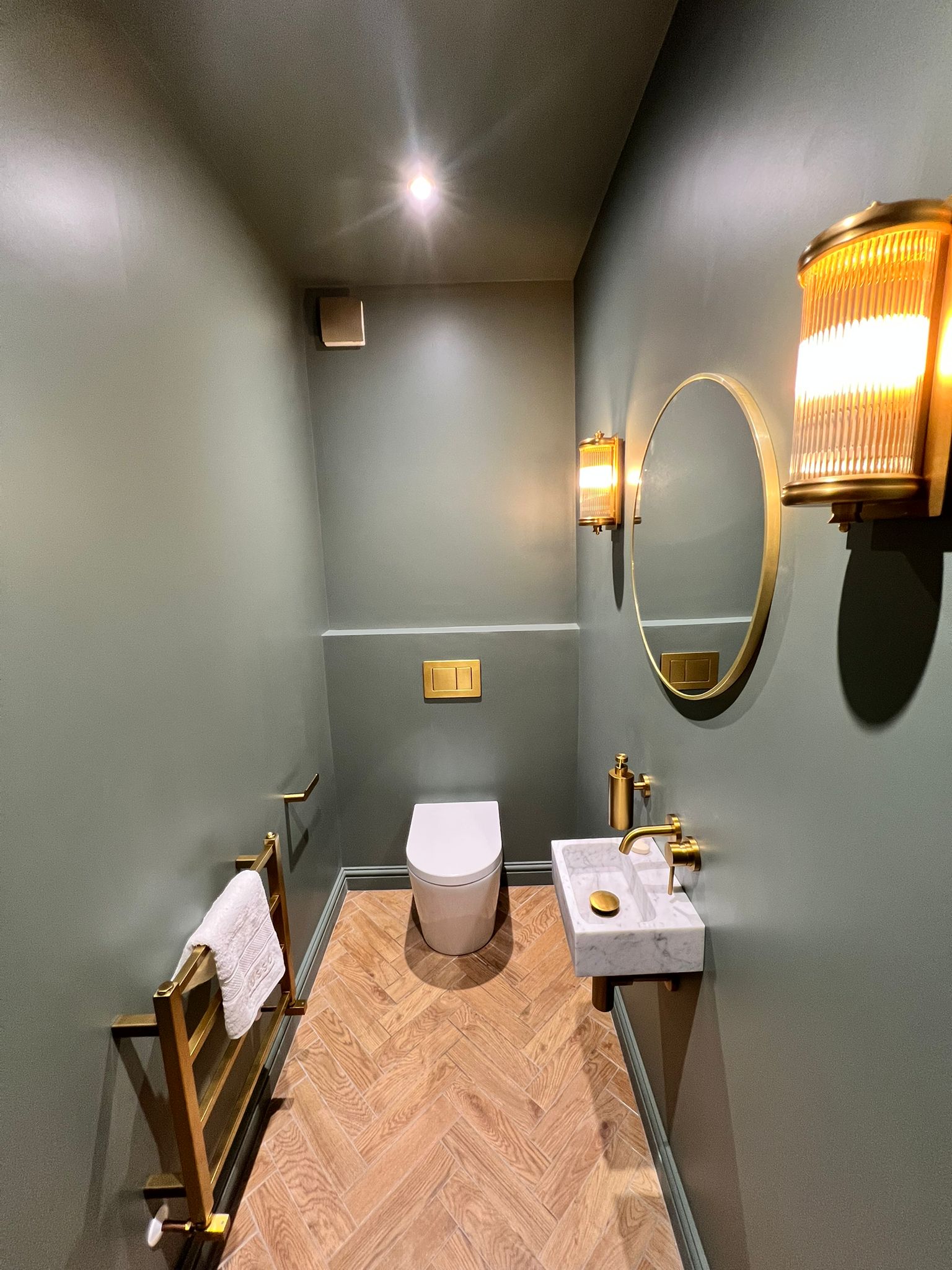 The project involved knocking through from the hallway to create access into the newly built bathroom. The space was thoughtfully designed and fitted with a WC, sink, heated towel rail, decorative wall lighting, and stylish herringbone flooring — all chosen to create a warm, modern, and practical finish.